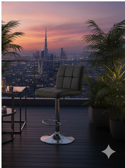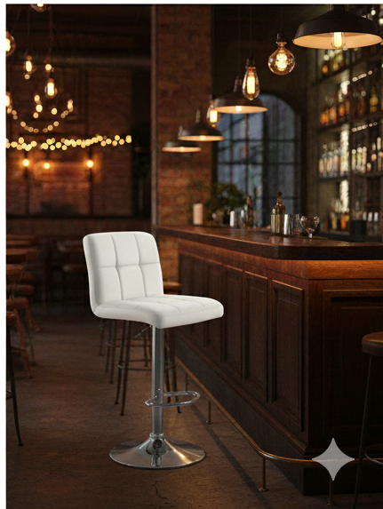 This premium bar stool features an elegant quilted upholstered seat and a supportive high backrest for a luxury aesthetic. Equipped with a polished chrome pedestal, it offers 360-degree swivel mobility and a smooth gas-lift mechanism for height adjustment. The stylish design and integrated footrest make it a perfect addition to modern kitchen islands, home bars, or upscale commercial lounges.